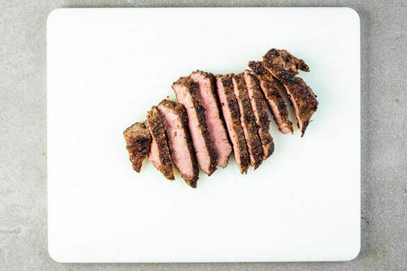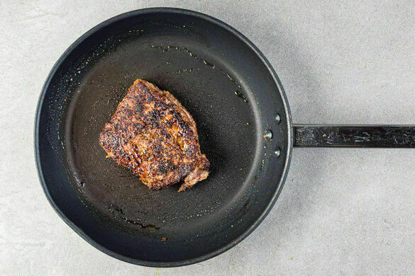 Das Fleisch in einer großen Pfanne mit 2EL Pflanzenöl bei starker Hitze auf jeder Seite 2–4Min. scharf anbraten, je nach Dicke des Fleisches. Die Hitze reduzieren und das Fleisch noch 1–3Min. abgedeckt garen, je nachdem, ob es medium oder durch sein soll. Das Fleisch abgedeckt auf einem Teller ruhen lassen.