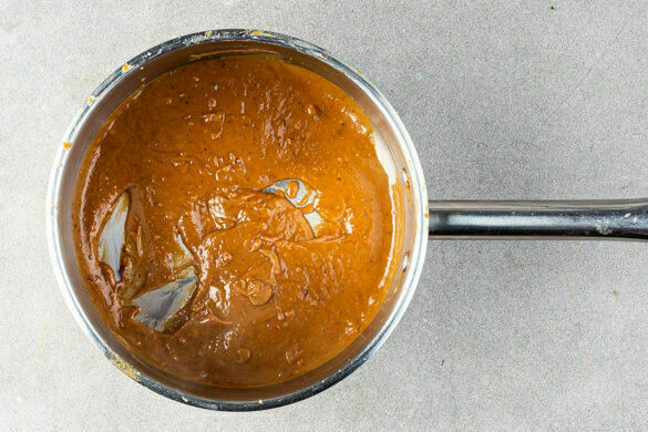 Die 1/2 der Chiliflocken und das restliche Currypulver in einem kleinen Topf mit 2EL Pflanzenöl bei mittlerer bis niedriger Hitze ca. 30Sek. anbraten. Die Erdnussbutter, die Worcestershiresauce, 150ml Wasser, 1–2EL hellen Essig und 2TL Honig hinzufügen und unter ständigem Rühren erwärmen, bis das Erdnussdressing eingedickt ist, dann vom Herd nehmen.