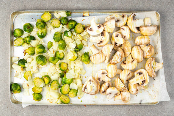 Den Backofen auf 240°C (220°C Umluft) vorheizen. Die Zwiebeln schälen, halbieren und grob würfeln. Den Rosenkohl halbieren und mit den Zwiebeln, dem Kreuzümmel, 2EL Olivenöl und 1/2TL Salz auf einem mit Backpapier ausgelegten Backblech vermengen. Im mittleren und unteren Teil des Ofens 18–22Min. weich und goldbraun backen, dabei gelegentlich wenden.