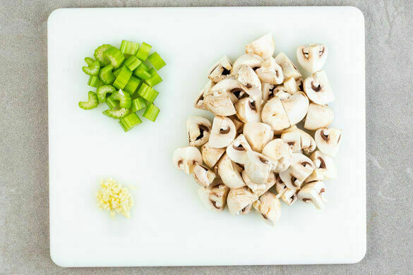In einem großen Topf ausreichend gesalzenes Wasser für die Gnocchi zum Kochen bringen. 1 Selleriestange in ca. 1cm dicke Scheiben schneiden. Die Pilze ggf. säubern und je nach Größe halbieren oder vierteln. Den Knoblauch schälen und fein würfeln.