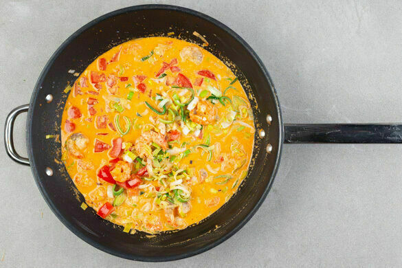 Zeit für ein cremiges Curry! Zarter Lauch, fruchtige Tomaten, zitronig-würziger Ingwer und aromatisches Thai-Basilikum machen aus diesem asiatischen Gericht eine echte Gaumenfreude. Feine Garnelen liefern eine Extraportion Eiweiß und die gelbe Currypaste heizt uns ordentlich ein. Und dann ist es auch noch ruckzuck fertig! Was will man mehr?
