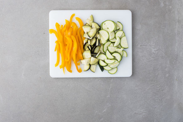 Die Paprika vierteln, entkernen und in Streifen schneiden. Die Aubergine längs vierteln und quer in dünne Scheiben schneiden. Die Zucchini längs halbieren und ebenfalls quer in dünne Scheiben schneiden.