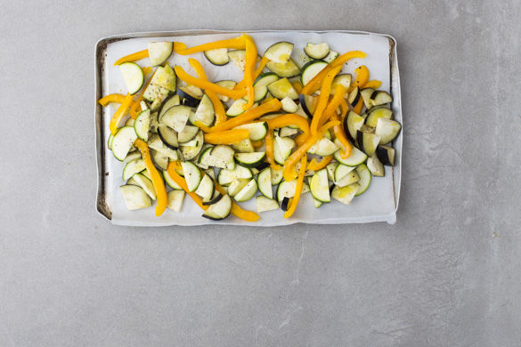 Das Gemüse mit Salz, Pfeffer und 1-2EL Olivenöl vermengen, auf einem mit Backpapier ausgelegtem Backblech verteilen und ca. 8-10Min. unter den Grill legen.