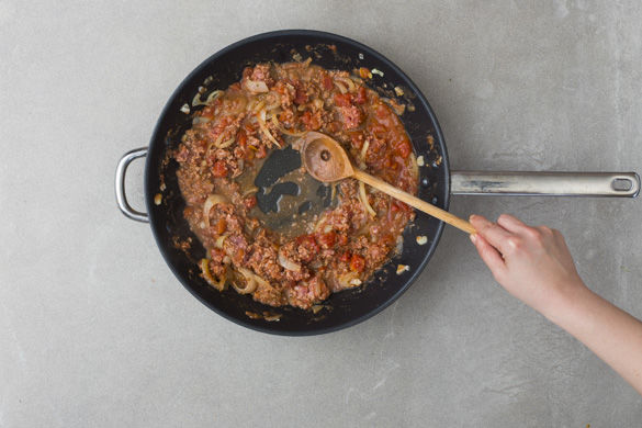 Die Zwiebeln und den Knoblauch mit 1-2EL Olivenöl in einer mittelgroßen Pfanne ca. 1-2Min. auf mittlerer Hitze glasig braten, dann das Hackfleisch zugeben und krümelig braten. Die Tomaten unterrühren und die Sauce ca. 5-6Min. einköcheln lassen. Mit Salz, Pfeffer und der Hälfte des Oreganos abschmecken.