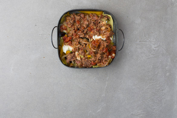 Den Backofen nun auf 200°C Umluft umstellen. Den Mozzarella in dünne Scheiben schneiden. In einer Auflaufform die Hacksauce abwechselnd mit Grillgemüse, Mozzarella und Lasagneplatten schichten, mit einer Schicht Hackfleischsauce abschließen.