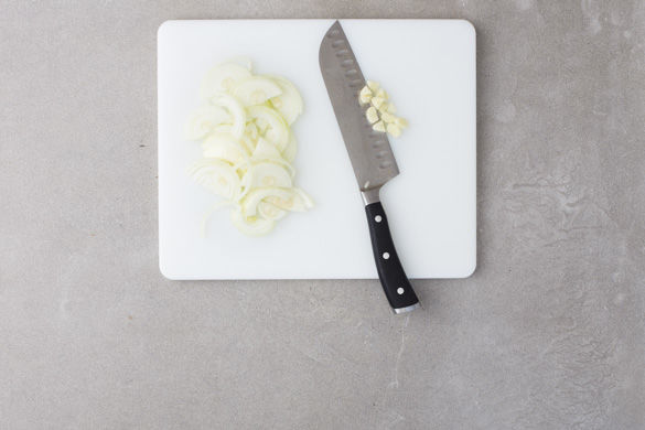 Den Grillbackofen auf 250°C vorheizen. Die Zwiebeln und den Knoblauch schälen, halbieren und fein würfeln.