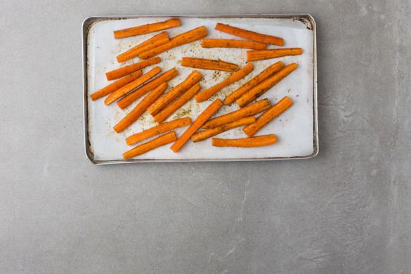 Die Karottenpommes mit etwas Salz, Pfeffer, Gemüsesalz und 1EL Olivenöl vermengen, gleichmäßig auf einem mit Backpapier ausgelegten Backblech verteilen und ca. 15-20Min. im Ofen backen.