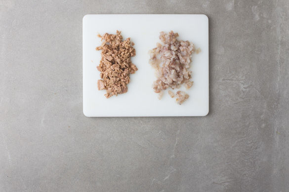 Inzwischen den Thunfisch über einem Sieb abtropfen lassen, dann fein hacken. Den Seelachs zuerst in Streifen schneiden, dann ebenfalls fein hacken. Vorsicht! Die Seelachsfilets können Gräten besitzen. Diese am besten vor dem Schneiden mit einer Pinzette oder einer Flachzange herausziehen. Ansonsten einfach beim Essen auf die Gräten achten.