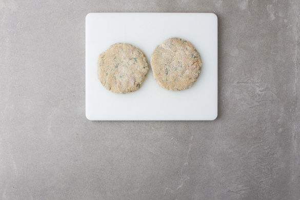 Nun den Thunfisch mit dem Seelachs, den Eiern und der restlichen Petersilie verkneten und mit Salz und Pfeffer abschmecken. Dann so viel von den Semmelbröseln untermengen, bis eine formbare Masse entsteht. 4 flache Burgerpatties formen, ggf. in den restlichen Bröseln wenden.