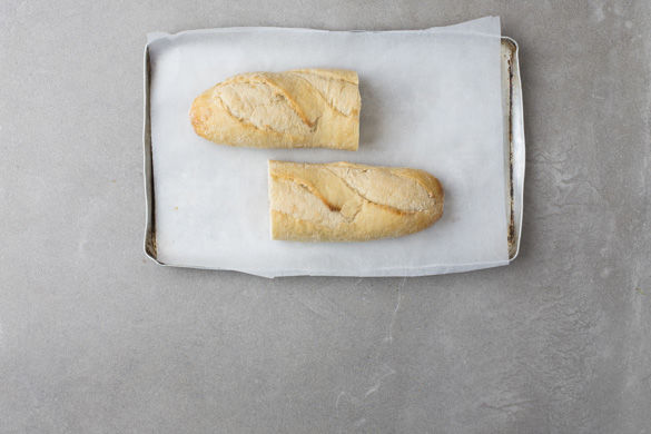 Die Brötchen mit etwas Wasser befeuchten und auf einem mit Backpapier ausgelegten Backblech ca. 2-5Min. im Ofen aufbacken, bis sie goldbraun sind.