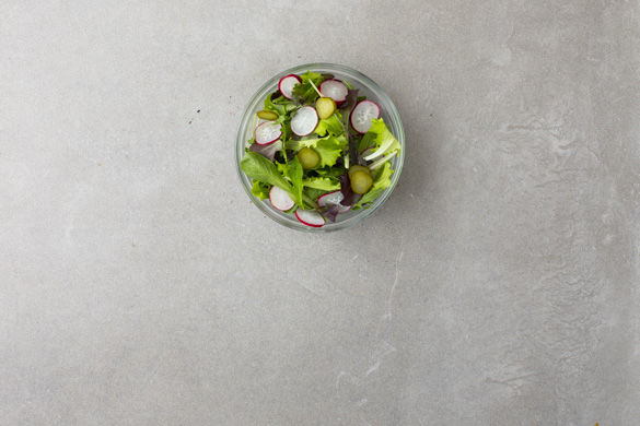 Die Kresse mit einer Schere abschneiden und die Hälfte der Kresse mit je 1EL Olivenöl und Essig nach Wahl mischen. Die Radieschen putzen und in feine Scheiben schneiden. Die Gewürzgurke ebenfalls in dünne Scheiben schneiden.