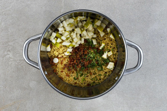 Die Birnen vierteln, vom Kerngehäuse befreien und in möglichst kleine Würfel schneiden. Die Lauchzwiebeln in feine Ringe schneiden. Die Petersilie samt Stängeln fein hacken. Die Rosinen fein hacken.