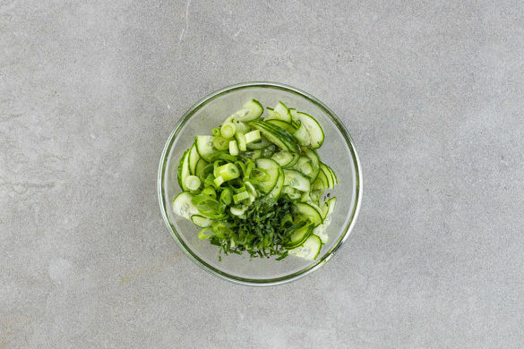 Die Gurke längs halbieren und quer in feine Scheiben schneiden. Aus 2–3EL Olivenöl, 1–2EL Essig sowie Salz, Pfeffer und Zucker nach Geschmack ein Dressing anrühren und mit den Gurken vermengen. Den Gurkensalat ca. 5Min. ziehen lassen, dann die 1/2 der Lauchzwiebeln und ca. 1/4 der Petersilie untermengen. Nach Geschmack mit Salz und Pfeffer nachwürzen.