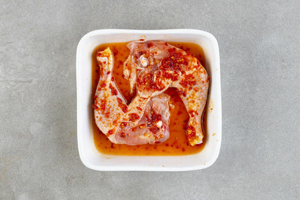 Die Hähnchenteile in eine Auflaufform legen und im Ofen 30–40Min. backen, bis das Fleisch in der Mitte gar ist. Dabei die Hähnchenteile alle 10Min. wenden, damit sie von allen Seiten knusprig braun werden. Ca. 5Min. vor Ende der Garzeit 50ml Wasser angießen.