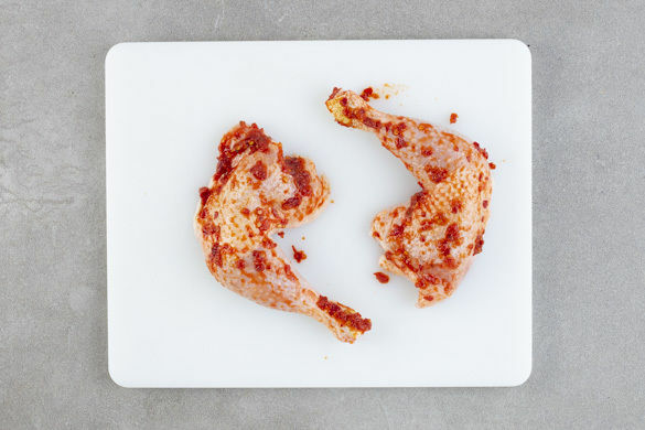 Den Backofen auf 240°C (220°C Umluft) vorheizen. In einem mittelgroßen Topf 1,5L Wasser für den Bulgur zum Kochen bringen. Die Hähnchenteile mit etwas Küchenkrepp trocken tupfen und mit dem Sambal Oelek und 1 kräftigen Prise Salz einreiben.