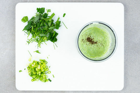 Die „Salatsauce der grünen Göttin“ ist ein Klassiker, der in den USA in den 1920er-Jahren als Hommage an das damals äußerst beliebte Theaterstück „Die grüne Göttin“ entstanden sein soll. Unsere Version mit u. a. drei frischen Kräutern und Mayonnaise ist die köstliche Raffinesse zum knusprigen Hähnchenschnitzel, feinen Babykartoffeln und natürlich dem erfrischenden Gurkensalat!
