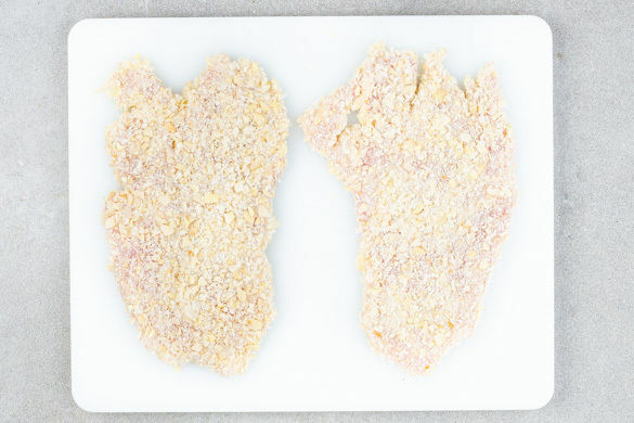 4–5EL Mehl, 100ml Wasser und 1/2TL Salz zu einem geschmeidigen Teig verrühren. Das Fleisch mit etwas Küchenkrepp trocken tupfen, jeweils längs halbieren und zwischen Frischhaltefolie mit einem Fleischklopfer oder einer schweren Pfanne ca. 0,5cm dünn plattieren. Das Fleisch erst im Teig, dann in den Panko-Mandel-Bröseln wenden und die Panade leicht andrücken.