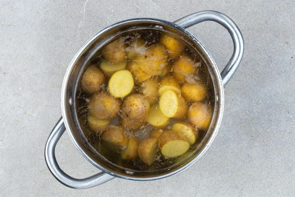In einem mittelgroßen Topf ausreichend gesalzenes Wasser für die Kartoffeln zum Kochen bringen. Die Kartoffeln halbieren, in das kochende Wasser geben und in 15–17Min. bissfest kochen.