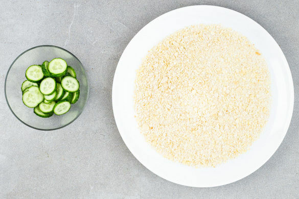 Die Mandeln fein hacken und auf einem großen Teller mit dem Panko-Paniermehl und 1 Prise Salz vermengen. Die Gurke in dünne Scheiben schneiden.