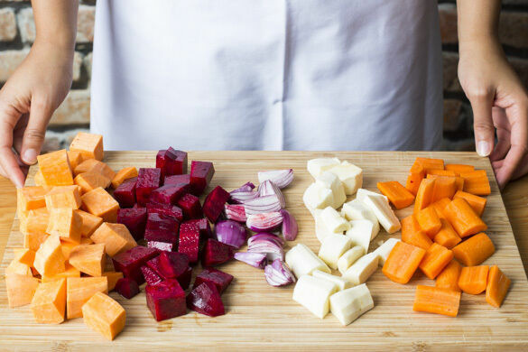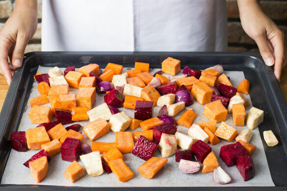 Den Backofen auf 200ºC (180ºC Umluft) vorheizen. Die Roten Beten schälen und würfeln. Tipp: Da Rote Bete stark färbt, beim Verarbeiten am besten Küchenhandschuhe und Schürze tragen. Die Zwiebeln schälen, halbieren und in Spalten schneiden. Die Karotte ggf. schälen und mit den Pastinaken und den Süßkartoffeln samt Schale in grobe Würfel schneiden.