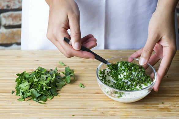 Den Schnittlauch in feine Ringe schneiden und mit dem Joghurt verrühren. Den Dip mit Salz und Pfeffer abschmecken. Die Petersilie samt Stängeln grob schneiden.