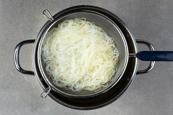 In einem mittelgroßen Topf ausreichend gesalzenes Wasser für die Nudeln aufkochen. Die Nudeln in das kochende Wasser geben, den Topf vom Herd nehmen und die Nudeln 3–5Min. gar ziehen lassen. In ein Sieb abgießen, dann mit 1EL Pflanzenöl vermengen, damit die Nudeln nicht zusammenkleben.