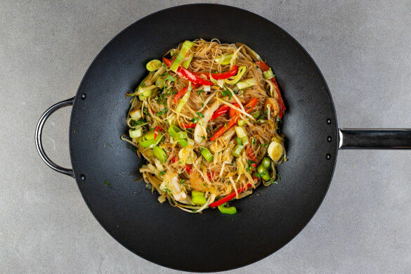 Lust auf ein herzhaftes Omelett? Wir auch! Immer, eigentlich. Aber dauernd das Gleiche ist langweilig, also haben wir heute mal wieder über den Tellerand geschaut und uns Inspiration aus Asien geholt: Knackiges Gemüse wird in der Pfanne mit einer aromatischen Sauce aus Ingwer, Knoblauch, Hoisin, Limette und Sesamöl gebraten und mit Glasnudeln serviert. Darauf machen sich das Omelett und frischer Koriander bestens!