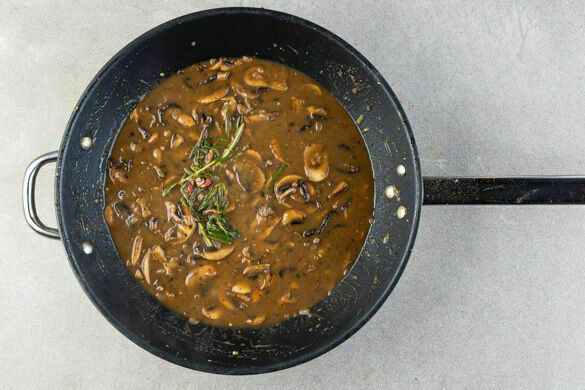 Jeweils 1EL Butter und Mehl einrühren, bis sich das Mehl aufgelöst hat, dann 300ml Wasser angießen und das Steinpilzpulver sowie das Brühgewürz unterrühren. Die Pilzpfanne bei mittlerer bis niedriger Hitze 7–8Min. sanft köcheln lassen, bis die Sauce eingedickt ist. Mit Salz und Pfeffer abschmecken.