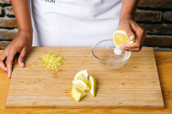 In einem mittelgroßen Topf ausreichend gesalzenes Wasser für die Pasta zum Kochen bringen. Die Zitronenschale fein abreiben und die Zitrone halbieren, eine Hälfte auspressen, die andere Hälfte in Spalten schneiden.