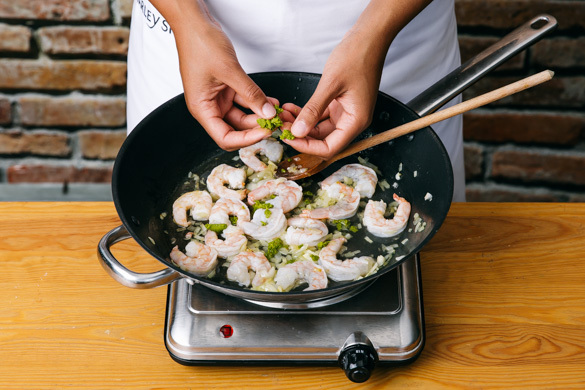 Die Garnelen in einem Sieb mit kaltem Wasser abspülen und mit etwas Küchenkrepp trocken tupfen, dann zu den Zwiebeln in die Pfanne geben und bei starker Hitze 2–3Min. mitbraten. Mit 100ml Wasser ablöschen, die 1/2 des Brühgewürzes darin auflösen und alles bei mittlerer Hitze 2–3Min. sanft köcheln lassen.