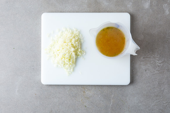 Die Zwiebel schälen, halbieren und in feine Würfel schneiden. Das Brühgewürz in 800ml heißem Wasser auflösen.