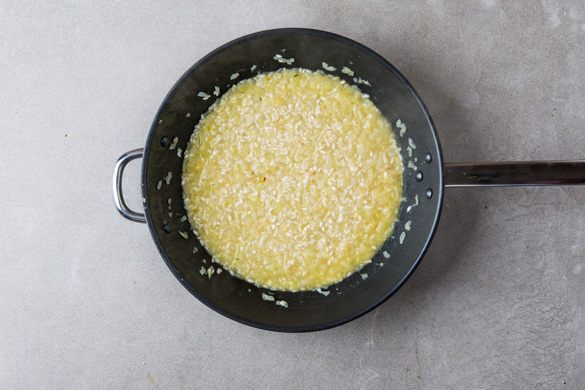 Die Zwiebeln in einer großen Pfanne mit 1EL Olivenöl bei mittlerer Hitze 1–2Min. glasig anschwitzen. Den Reis dazugeben und 1–2Min. mitrösten, dann nach und nach unter Rühren die Brühe zugeben und einköcheln lassen, bis die gesamte Brühe aufgebraucht ist, das dauert 18–20Min. Das Risotto sollte sämig sein, der Reis aber noch Biss haben.