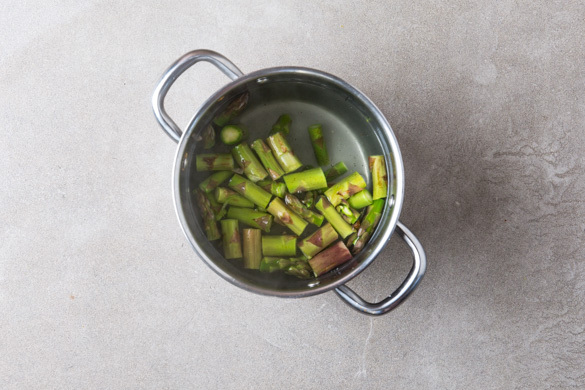 Zwischendurch in einem mittelgroßen Topf leicht gesalzenes Wasser für den Spargel zum Kochen bringen. Die holzigen Enden des Spargels abschneiden und die Stangen in 2–3cm lange Stücke schneiden. Die Zucchini mit einer Küchenreibe grob raspeln. Die Basilikumblätter abzupfen und in feine Streifen schneiden. Den Käse fein reiben.