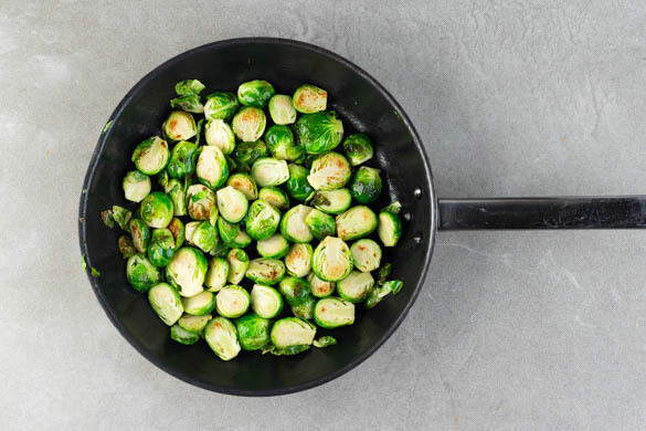 Die Rosenkohlhälften in einer mittelgroßen Pfanne mit 1EL Olivenöl, ½TL Salz und 1 Prise Zucker bei mittlerer Hitze ca. 2Min. anbraten. Mit ca. 4EL Wasser ablöschen und abgedeckt 5Min. dämpfen. Während der letzten ca. 2Min. die Rosenkohlblätter unterrühren und mitgaren. Währenddessen den Grillkäse in ca. 1cm kleine Würfel schneiden.