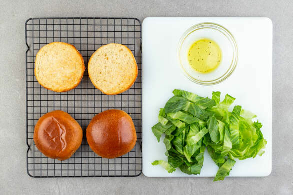 Den Salat in ca. 1cm dünne Streifen schneiden, den Strunk entfernen. Für das Dressing jeweils 2EL Olivenöl, Essig und Wasser oder Fruchtsaft verrühren und das Dressing mit Salz und Pfeffer sowie 1 Prise Zucker abschmecken. Die Brötchen leicht befeuchten, dann aufschneiden und 3–4Min. im Ofen aufbacken.