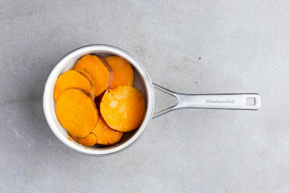 Den Backofen auf 240°C (220°C Umluft) vorheizen. In einem mittelgroßen Topf 1L Wasser mit 2TL Salz aufkochen. Die Süßkartoffeln samt Schale in ca. 0,5cm dicke Scheiben schneiden. Die Süßkartoffeln ins kochende Wasser geben und 3–4Min. kochen, bis sie etwas weicher werden. In einem Sieb abtropfen lassen. Zurück in den Topf geben, mit 2EL Olivenöl und der ½ der Gewürzmischung vermengen.