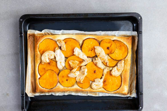 Die Teige mit dem Papier nach unten auf zwei Backblechen ausrollen. Die Süßkartoffeln auf den Teigen verteilen, dabei jeweils einen Rand von ca. 1cm frei lassen. Das Fleisch zwischen den Süßkartoffeln verteilen. Die Tartes 12–14Min. im Ofen backen, bis der Teig goldbraun und das Fleisch gar ist. Je nach Ofen die Position der Bleche nach der Hälfte der Zeit tauschen.
