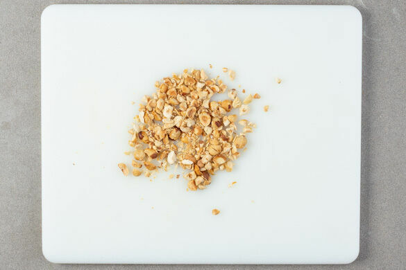 Die Haselnüsse in einem zweiten Topf bei mittlerer Hitze 3–4Min. goldbraun anrösten, dabei regelmäßig rühren. Die Nüsse anschließend grob hacken oder in eine Tüte geben und mit einem schweren Topf in kleine Stücke schlagen. In demselben Topf ca. 1,5L leicht gesalzenes Wasser für das Gemüse zum Kochen bringen.