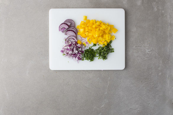 Den Backofen auf 220°C Umluft oder 240°C Ober-/Unterhitze vorheizen. Die Zwiebel schälen und halbieren, eine Hälfte in feine Würfel, die zweite in ca. 1cm breite Spalten schneiden. Die Paprika vierteln, entkernen und in ca. 1-2cm große Würfel schneiden. Die Hälfte der Basilikumblätter fein hacken. Die Petersilie samt Stängeln ebenfalls fein hacken.