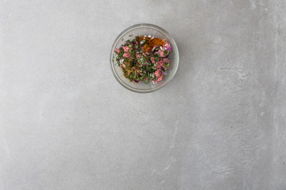 Das Hackfleisch mit den Zwiebelwürfeln, dem gehackten Basilikum und der Hälfte der Petersilie vermengen. Nach Geschmack mit Paprikagewürz, Salz und Pfeffer abschmecken.