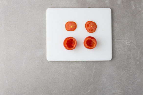 Die Deckel der Tomaten ca. 1cm dick abschneiden und das Innere mit einem Löffel aushöhlen. Die Kerne und den Deckel aufbewahren. Nun die Fleischfüllung in die Tomaten verteilen, den Deckel wieder auflegen und die Tomaten in eine eingeölte Auflaufform setzen.