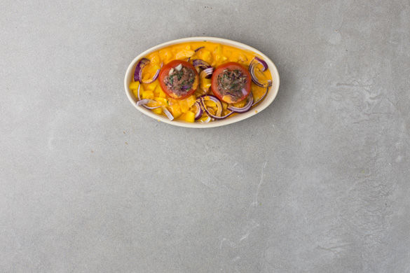 Die Tomatenkerne mit 2EL Olivenöl mit einem Stabmixer pürieren und mit Salz und Pfeffer abschmecken. Die Paprikawürfel und die Zwiebelspalten um die Tomaten herum in der Auflaufform verteilen, dann die pürierten Tomaten angießen. Alles für ca. 20-25Min. im Ofen backen.