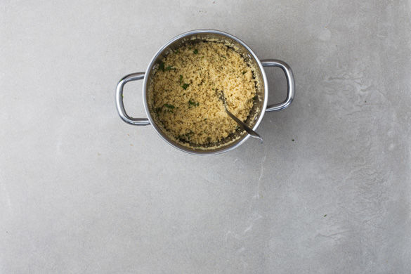 Inzwischen 275ml Wasser in einem Wasserkocher aufkochen und den Brühwürfel im heißen Wasser auflösen. Mit Ras el Hanout abschmecken. Den Couscous in einem mittelgroßen Topf mit der Brühe übergießen und zugedeckt ca. 8-10Min. quellen lassen, bis die gesamte Flüssigkeit aufgesogen ist.