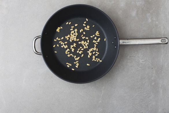 In einem mittelgroßen Topf ausreichend gesalzenes Wasser für die Pasta aufsetzen. Eine große Pfanne mittelhoch erhitzen und die Pinienkerne darin ca. 1Min. goldgelb anrösten. Vorsicht! Die Pinienkerne können schnell anbrennen! Zum Abkühlen aus der Pfanne nehmen, sie dunkeln sonst noch nach. Die Pfanne beiseitestellen.