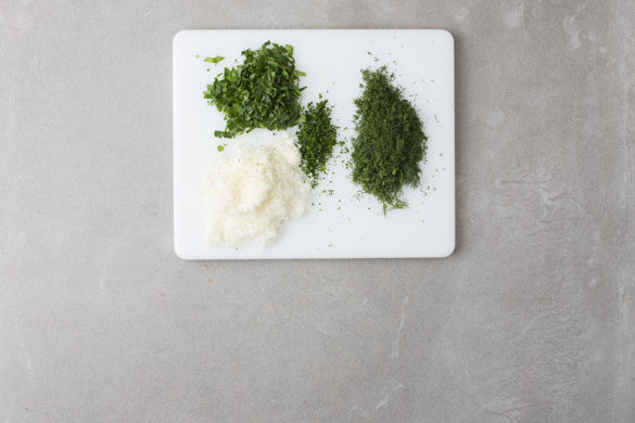 Inzwischen die Petersilie samt Stängeln fein hacken. Den Dill von den Stängeln streifen und ebenfalls fein hacken. Den Schnittlauch in feine Röllchen schneiden. Den Käse fein reiben.
