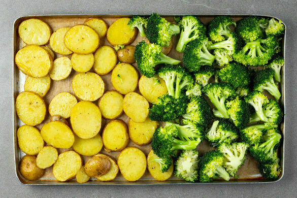 Den Brokkoli mit dem Zitronensaft, 2EL Pflanzenöl sowie je ½TL Salz und Pfeffer vermengen. Auf das Backblech mit den Kartoffeln geben, 10–12Min. bevor diese gar sind, und mitbacken. Tipp: Je nach Größe des Blechs ggf. ein zweites Backblech verwenden.