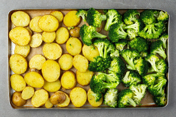 Den Brokkoli mit 2EL Zitronensaft, 1EL Pflanzenöl und je 1 kräftigen Prise Salz und Pfeffer vermengen. Auf das Backblech mit den Kartoffeln geben, 10–12Min. bevor diese gar sind, und mitbacken.