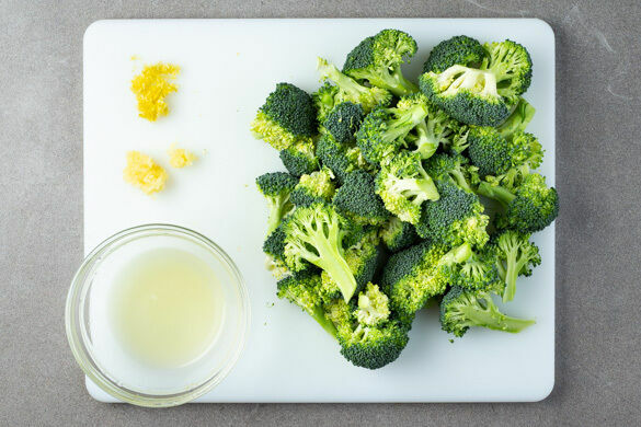 Den Backofen auf 240°C (220°C Umluft) vorheizen. Den Knoblauch schälen und fein würfeln. Die Zitronenschale abreiben, dann die Zitrone halbieren und auspressen. Den Brokkoli in mundgerechte Röschen schneiden.
