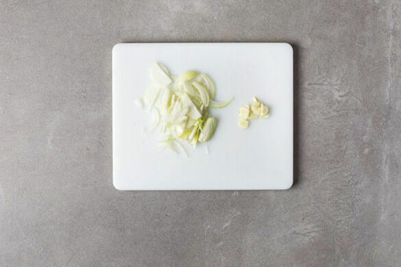 In einem großen Topf ausreichend gesalzenes Wasser für die Pasta zum Kochen bringen. Die Zwiebel schälen, halbieren und in feine Streifen schneiden. Den Knoblauch schälen und in feine Scheibchen schneiden.