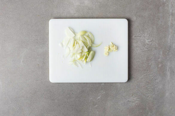 In einem mittelgroßen Topf ausreichend gesalzenes Wasser für die Pasta zum Kochen bringen. Die Zwiebel schälen, halbieren und in feine Streifen schneiden. Den Knoblauch schälen und in feine Scheibchen schneiden.